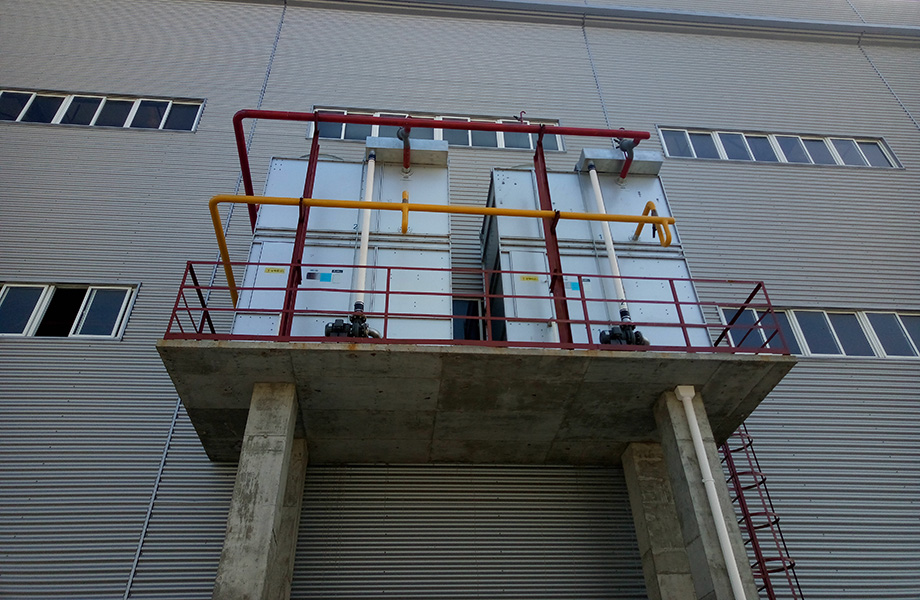 技术实现形式:低温冷藏库制冷系统采用1套比泽尔低温螺杆三并联制冷机组(3*HSN7471-75),1套3.5m³桶泵机组,2台海密梯克冷媒泵,自动热气化霜;¢26.4*2.0两翅铝排管,派克CK2系列气动截止阀,3间高温保鲜库制冷系统采用1套比泽尔高温螺杆四并联制冷机组(4*CSH6563-60),1套3.5m³桶泵机组,2台海密梯克冷媒泵,水冲霜;吊顶式冷风机,纤维布风管送风系统;高低温系统共用1台3m³高压储液器。